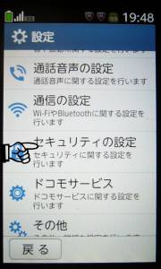 ![]() 設定メニュー画面をスライドし「セキュリティの設定」を押す。 |
